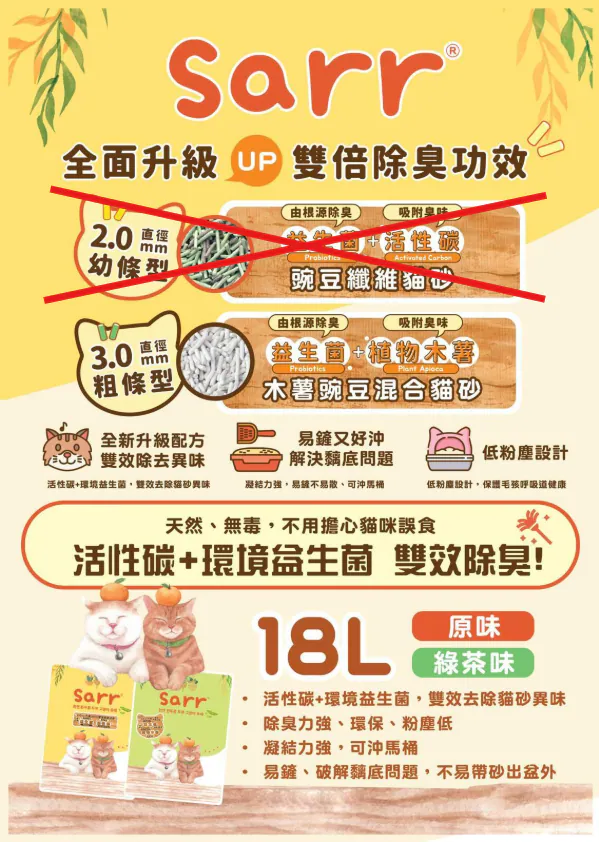 韓國SARR - 3.0mm「益生菌+木薯」雙重消臭 混合豌豆 豆腐貓砂 18L (升級配方)