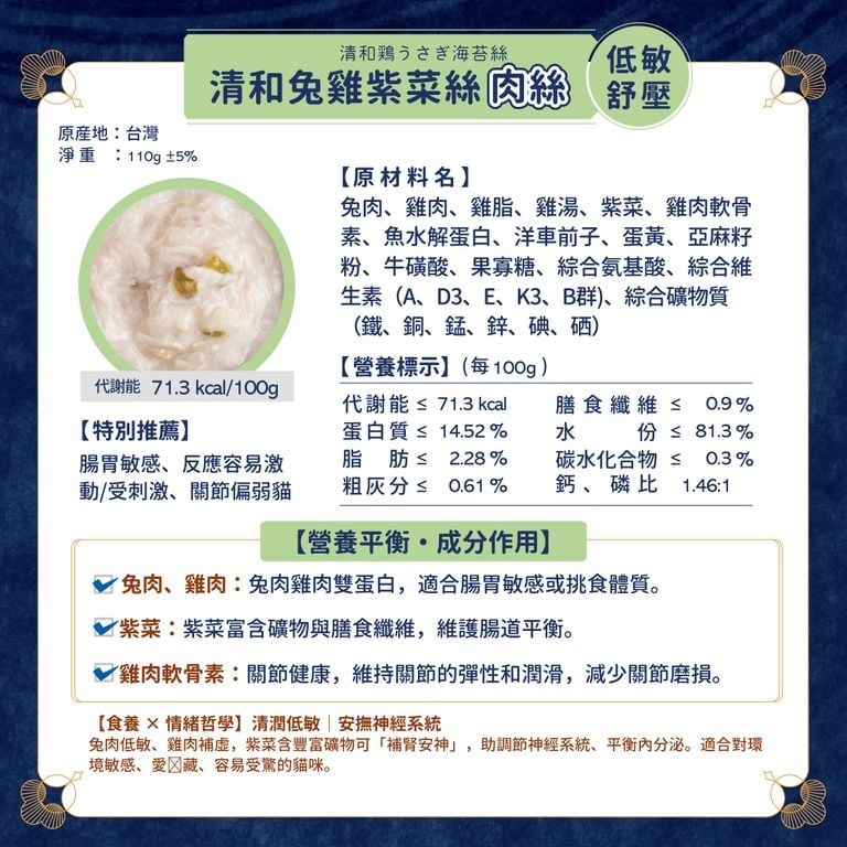 哲心研系列|肉絲營養主餐 MOMOcare 以東方食養理念,結合現代營養科學,為您的愛貓推出哲心研肉絲營養主餐。 我們相信「好情緒來自好腸胃,安定幸福從一餐開始」。哲心研象徵「哲理×心神×研究」,從科學出發,專為情緒理解與營養平衡。嚴選東方天然輔料:蓮子、枸杞、山藥、靈芝等,守護心神安定;堅持清燉無負擔(無香料、無膠、無穀),溫和易消化。 更添加魚水解蛋白、牛磺酸、蛋黃、益生元、維生素礦物質,提供全面營養。給牠穩定的每一天,讓照顧回歸平衡與理性。