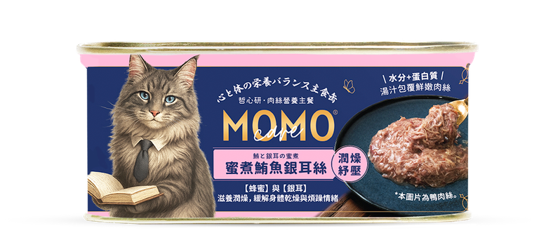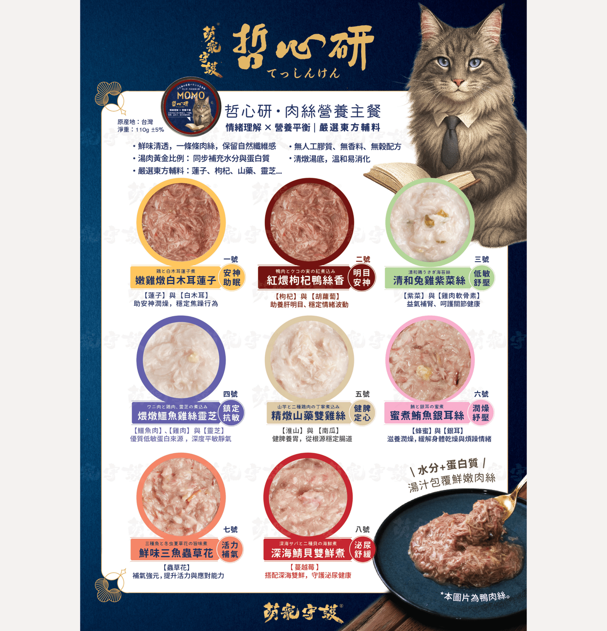 哲心研系列|肉絲營養主餐 MOMOcare 以東方食養理念,結合現代營養科學,為您的愛貓推出哲心研肉絲營養主餐。 我們相信「好情緒來自好腸胃,安定幸福從一餐開始」。哲心研象徵「哲理×心神×研究」,從科學出發,專為情緒理解與營養平衡。嚴選東方天然輔料:蓮子、枸杞、山藥、靈芝等,守護心神安定;堅持清燉無負擔(無香料、無膠、無穀),溫和易消化。 更添加魚水解蛋白、牛磺酸、蛋黃、益生元、維生素礦物質,提供全面營養。給牠穩定的每一天,讓照顧回歸平衡與理性。