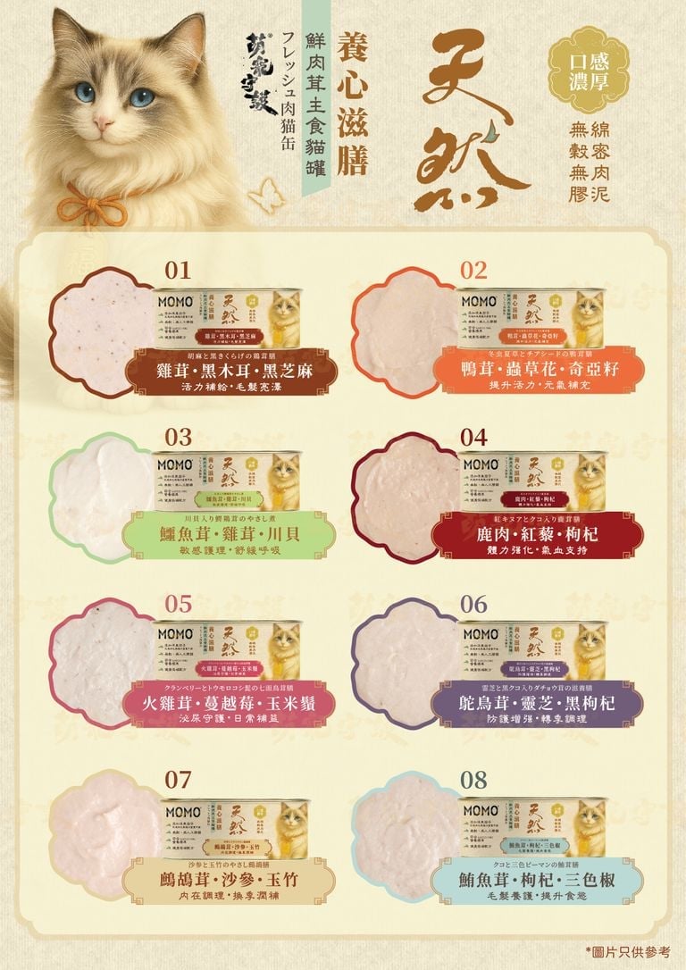 養心滋善系列|鮮肉泥營養主餐 MOMOcare 以東方食養理念,結合現代營養科學,為您的愛貓推出養心滋膳肉泥營養主餐。 我們相信「好情緒來自好腸胃,安定幸福從一餐開始」。養心滋膳象徵「以食養生,柔潤滋養」,結合溫和滋養湯底調理,專為情緒理解與營養平衡。 嚴選東方天然輔料:沙參、玉竹、蟲草花、紅藜、枸杞等,守五臟保血氣;堅持清燉無負擔(無香料、無膠、無穀),溫和易消化。 更添加魚水解蛋白、牛磺酸、蛋黃、益生元、維生素礦物質,提供全面營養。給牠穩定的每一天,讓照顧回歸平衡與理性。